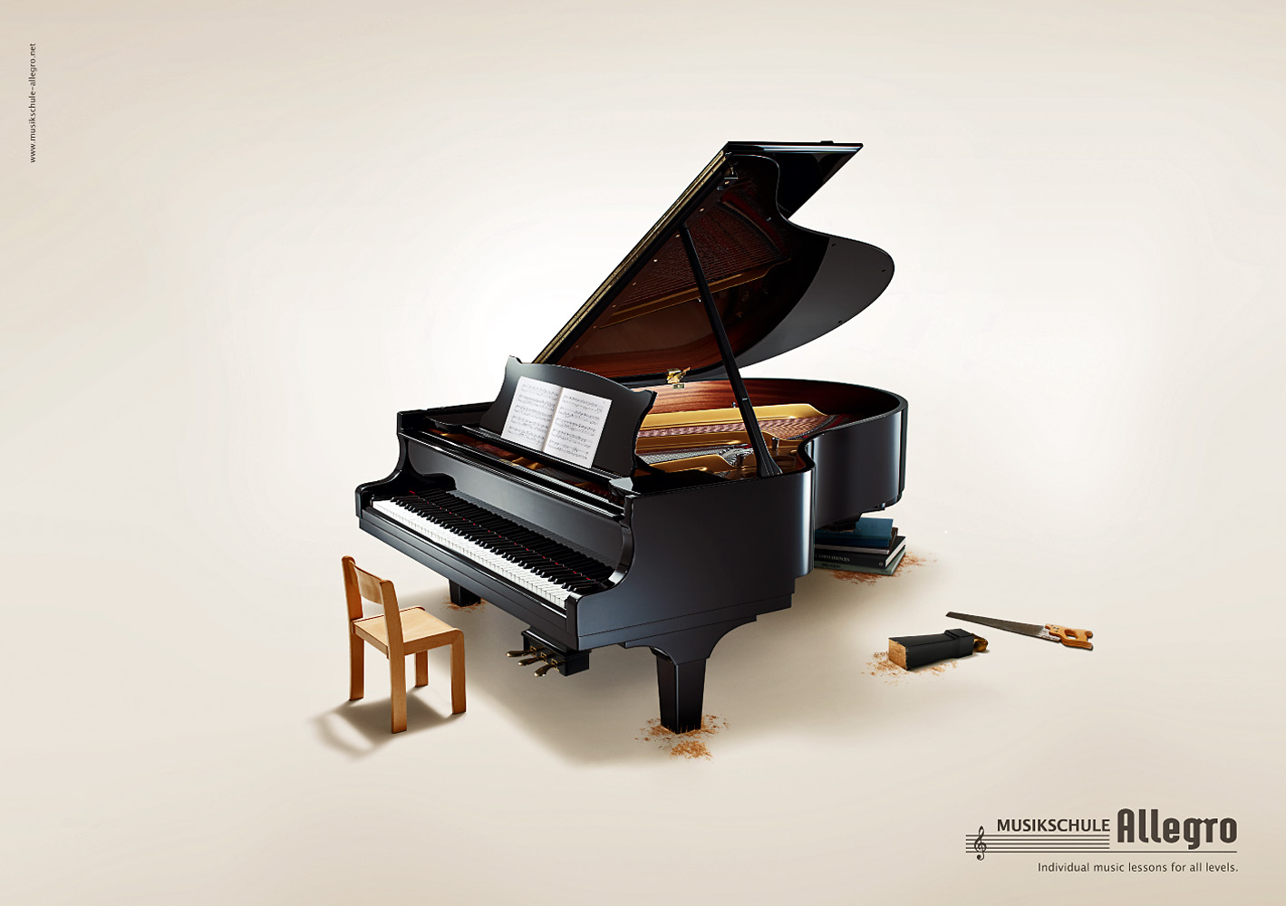 Der Fotograf Michael Haegele hatte den doch ungewöhnlichen Auftrag einen Konzertflügel für den Kunden „Musikschule Allegro“ in Szene zu setzten. Im Hinblick auf die Größe des Studio 3 der Cubic Studios konnte sich der Fotograf frei entfalten und so der Agentur Ogilvy & Mather ein hervorragendes Resultat präsentieren.